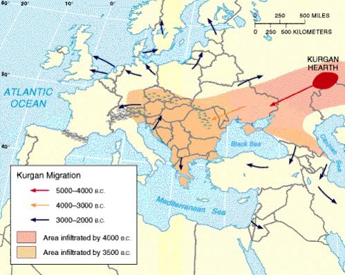 Come dimostra la cartina geografica, popolazioni indoeuropee, patriarcali e guerriere, provenienti dall'area caucasica e siberica, divenute patriarcali e guerriere per le cause che si possono leggere nel libro 'Kurgan, le origini della cultura europea' di M. Gimbutas, si introdussero in Europa, estinguendo o assoggettando con le armi le comunità gilaniche, imponendo un modello sociale gerarchico e guerresco, dove la forza fisica e l'autorità maschile erano gli elementi dominanti.