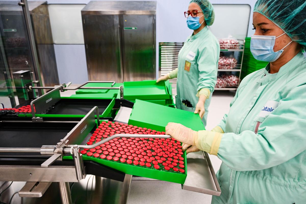| Tecnici di laboratorio confezionano fiale di vaccini COVID-19 in uno stabilimento di produzione ad Anagni, Italia, l'11 settembre 2020. (Vincenzo Pinto/AFP tramite Getty Images) |