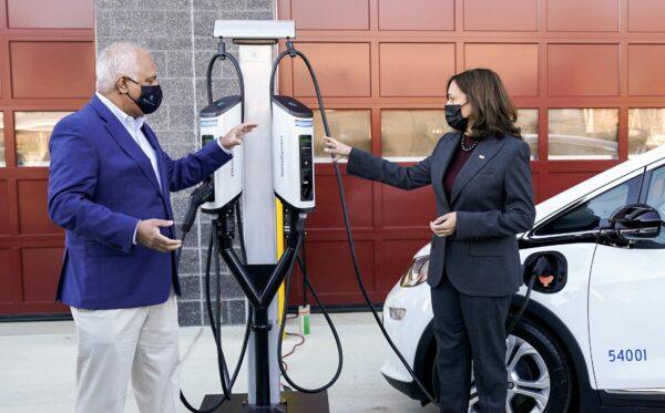 | Il vicepresidente Kamala Harris (a destra) parla con il CEO di Sema Connect Mahi Reddy presso l'impianto di manutenzione Brandywine della contea di Prince George durante una visita per annunciare il piano d'azione per la ricarica dei veicoli elettrici dell'amministrazione Biden-Harris, a Brandywine, Maryland, il 13 dicembre 2021. (Kevin Lamarque/Reuters) |