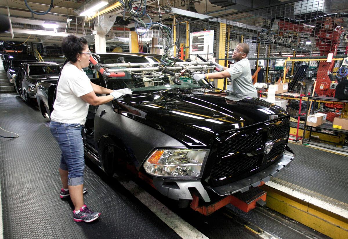 Gli operai installano un parabrezza su un camion Ram 1500 sulla linea di montaggio presso lo stabilimento Warren Truck Assembly Plant di Warren, Michigan, il 25 settembre 2014. Lo stabilimento era gestito da Chrysler, che ora fa parte di Stellantis. Bill Pugliano/Getty Images