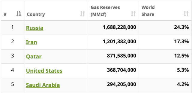 Qatar, Russia e Iran sono i maggiori detentori di riserve di gas al mondo. Nel 2009 hanno raggiunto un accordo per la creazione di una "troika del gas" , un'entità trilaterale di cooperazione nel settore del gas che include lo sviluppo di progetti congiunti.