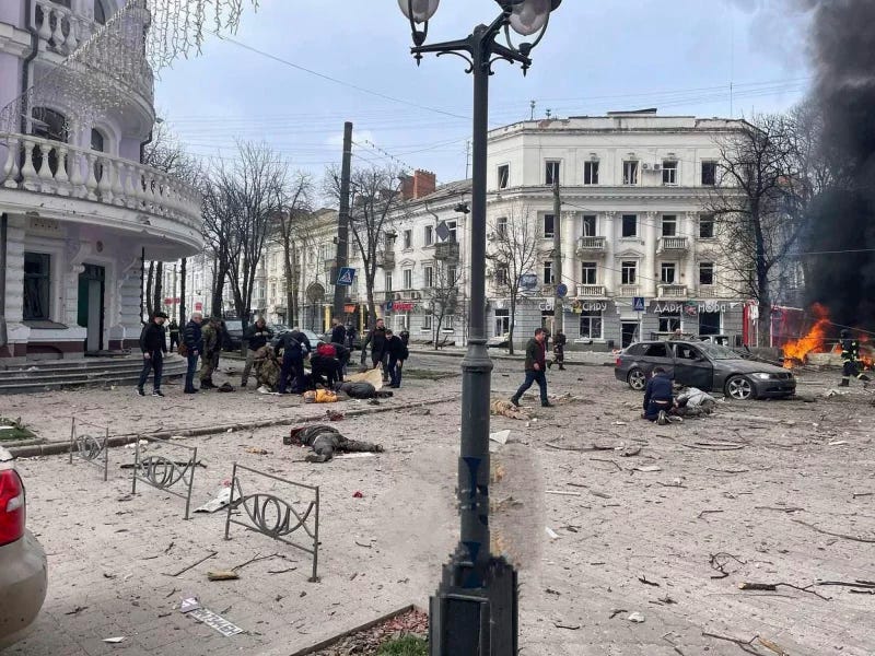 In questa foto fornita dal servizio stampa del Commissario per i diritti umani del Parlamento ucraino, i corpi dei residenti uccisi giacciono a terra dopo un attacco missilistico russo che ha ucciso almeno civili a Sumy, in Ucraina, domenica 13 aprile 2025. |