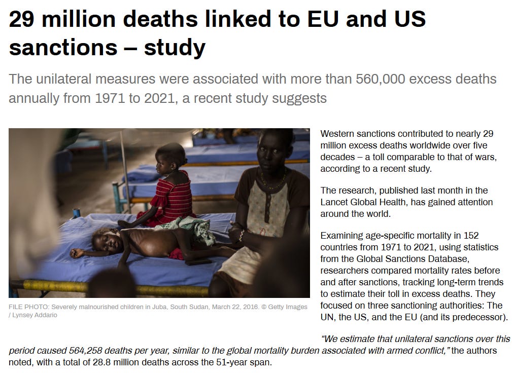 Queste sanzioni economiche sono tutt'altro che meramente teoriche ; comportano un profondo costo umano. Un recente studio, pubblicato in modo significativo su The Lancet Global Health , ha rivelato un impatto devastante associato a tali misure unilaterali. La ricerca, che ha esaminato meticolosamente la mortalità per età in 152 paesi dal 1971 al 2021, ha collegato direttamente le sanzioni unilaterali dell'UE e degli Stati Uniti a oltre 560.000 decessi in eccesso all'anno, accumulandosi fino a quasi 29 milioni di decessi in cinque decenni . Questo bilancio sconcertante è considerato "simile al carico di mortalità globale associato ai conflitti armati". Fondamentalmente, lo studio ha rilevato gli "effetti più forti per le sanzioni unilaterali, economiche e statunitensi", senza alcuna prova statistica di un effetto simile per le sanzioni ONU. Ancora più tragicamente, i decessi in eccesso hanno colpito in modo sproporzionato "i più vulnerabili: i bambini molto piccoli e gli anziani", con i bambini di età inferiore ai 5 anni che rappresentano uno scioccante 51% del bilancio totale delle vittime . Il rapporto ha concluso inequivocabilmente che le sanzioni compromettono la sicurezza economica e alimentare, causando fame e problemi sanitari diffusi, problemi ulteriormente aggravati dal continuo predominio del dollaro e dell'euro nelle transazioni globali, che amplifica l'impatto punitivo delle sanzioni degli Stati Uniti e dell'UE.