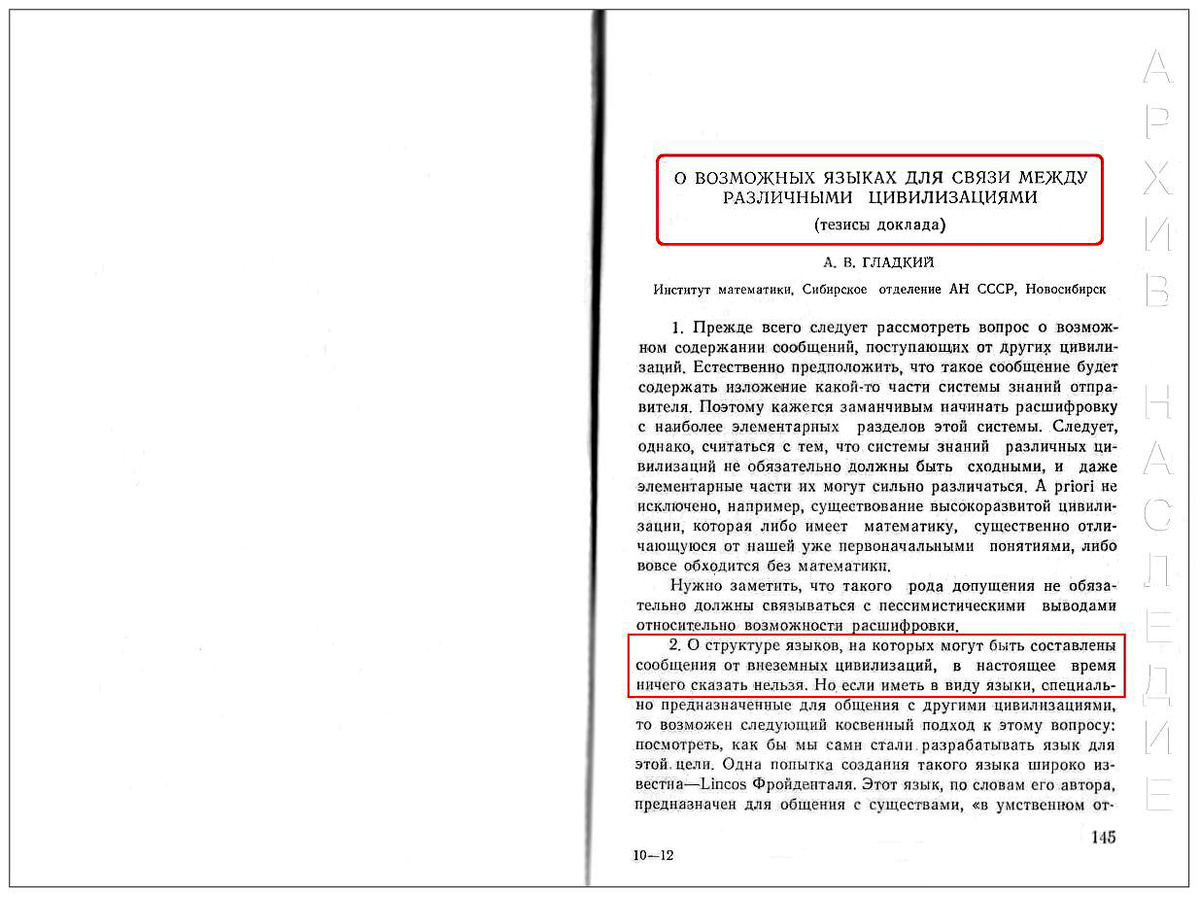 Il riassunto del rapporto " Sui possibili linguaggi di comunicazione tra diverse civiltà " è stato scritto dal professore di matematica e dottore in scienze fisiche e matematiche, ricercatore senior presso l'Istituto di matematica della filiale siberiana dell'Accademia russa delle scienze A.V. Gladky (1928-2018).