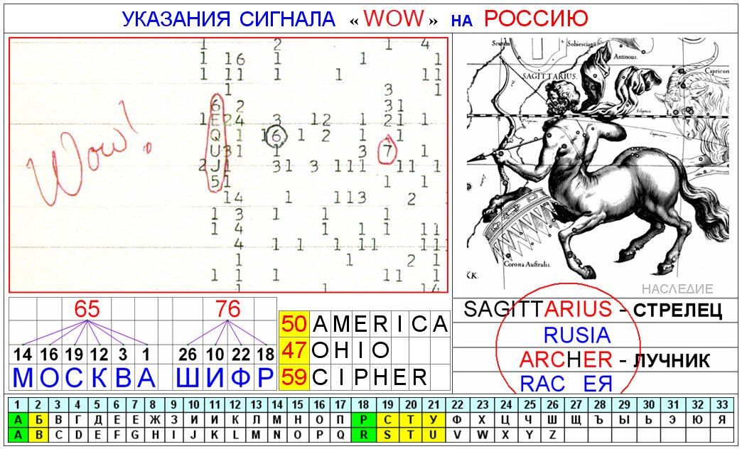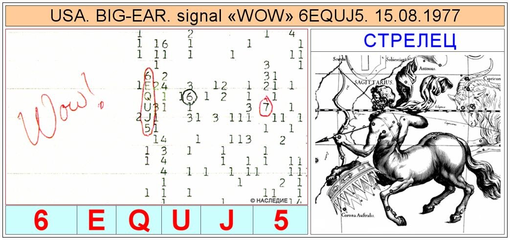 Siamo il gruppo di ricerca indipendente " Heritage ". Nei primi anni 2000, analizzando le informazioni sugli UFO, abbiamo scoperto un "algoritmo di comunicazione extraterrestre" e ne abbiamo presentato il funzionamento, utilizzando l'esempio della decodifica del segnale extraterrestre "Wow!", in una relazione alla Conferenza Internazionale di Ufologia tenutasi a Mosca nel 2011.