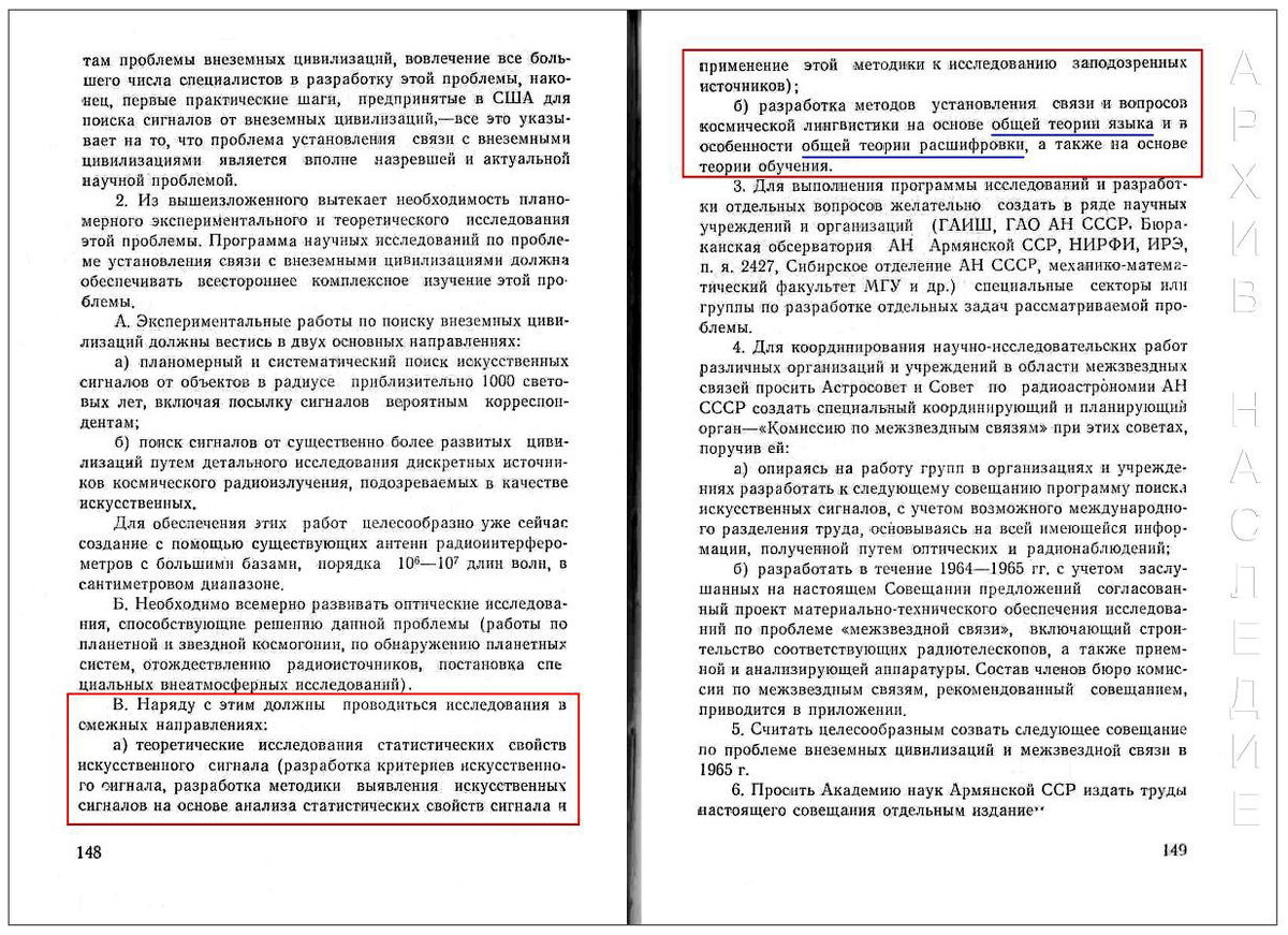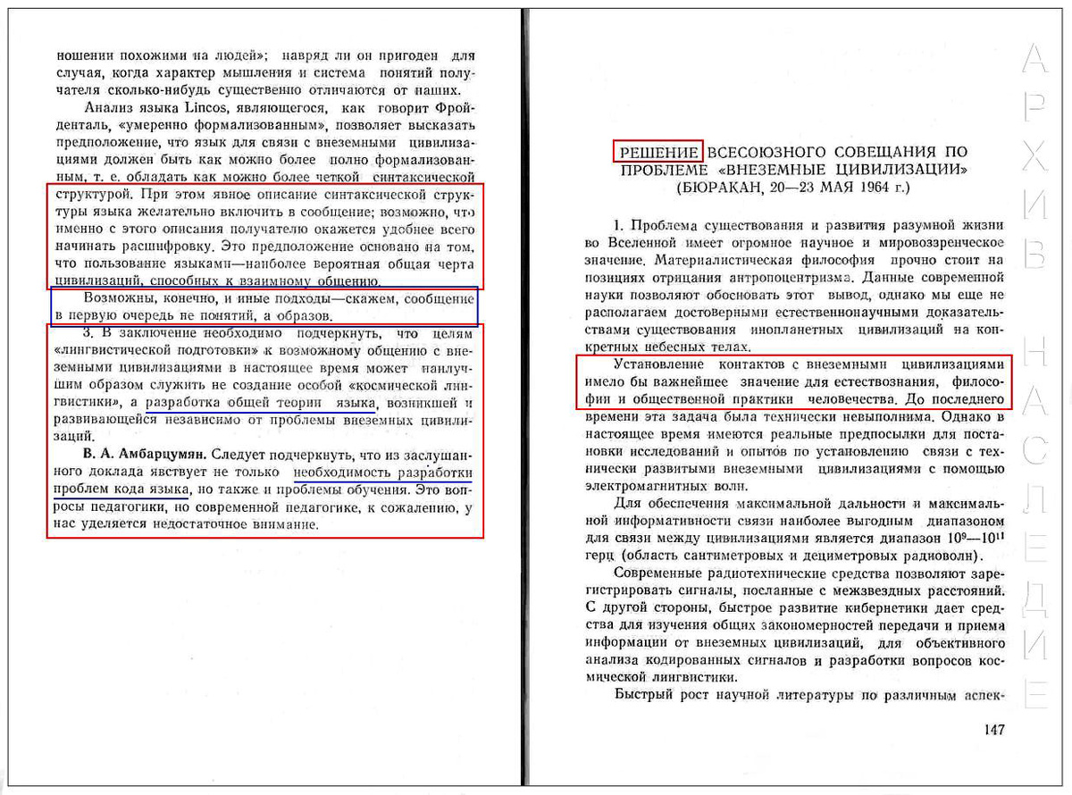 Di seguito sono riportate alcune citazioni tratte dalla decisione finale della Conferenza pan-sovietica sul problema delle civiltà extraterrestri, tenutasi a Byurakan dal 20 al 23 maggio 1964.