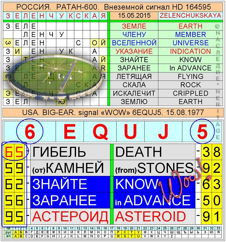 Ad esempio, il segnale spaziale registrato dall'Osservatorio Zelenchuk sul radiotelescopio RATAN-600 il 15 maggio 2015 ha ripetuto esattamente l'avvertimento del segnale WOW su un'imminente catastrofe dovuta a un asteroide per la Terra.