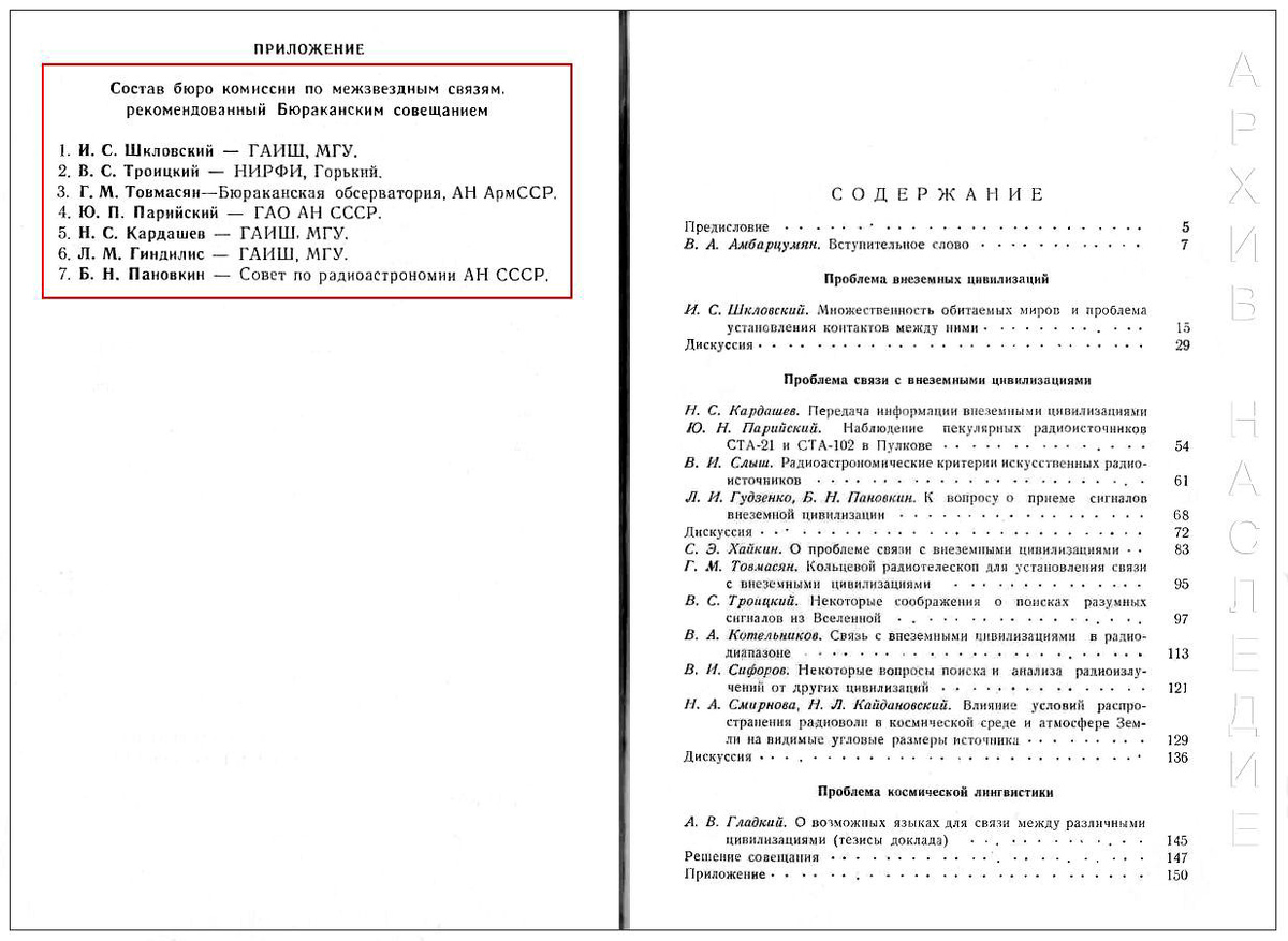 Composizione dell'ufficio della commissione raccomandata dalla Conferenza di Byurakan, che avrebbe dovuto lavorare sul problema delle comunicazioni interstellari.