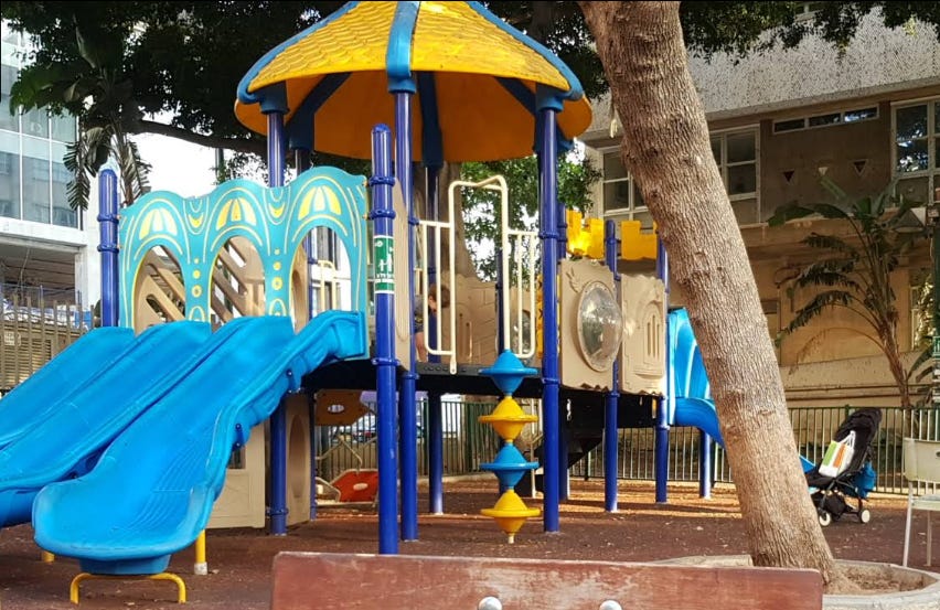 Foto di un parco giochi all'interno del Gerry Pencer Park nel quartiere Ha'Kirya di Tel Aviv, appena a ovest dell'ubicazione apparente del Sito 81, datata ottobre 2021. Credito: utente di Google Maps Or Baruch. |