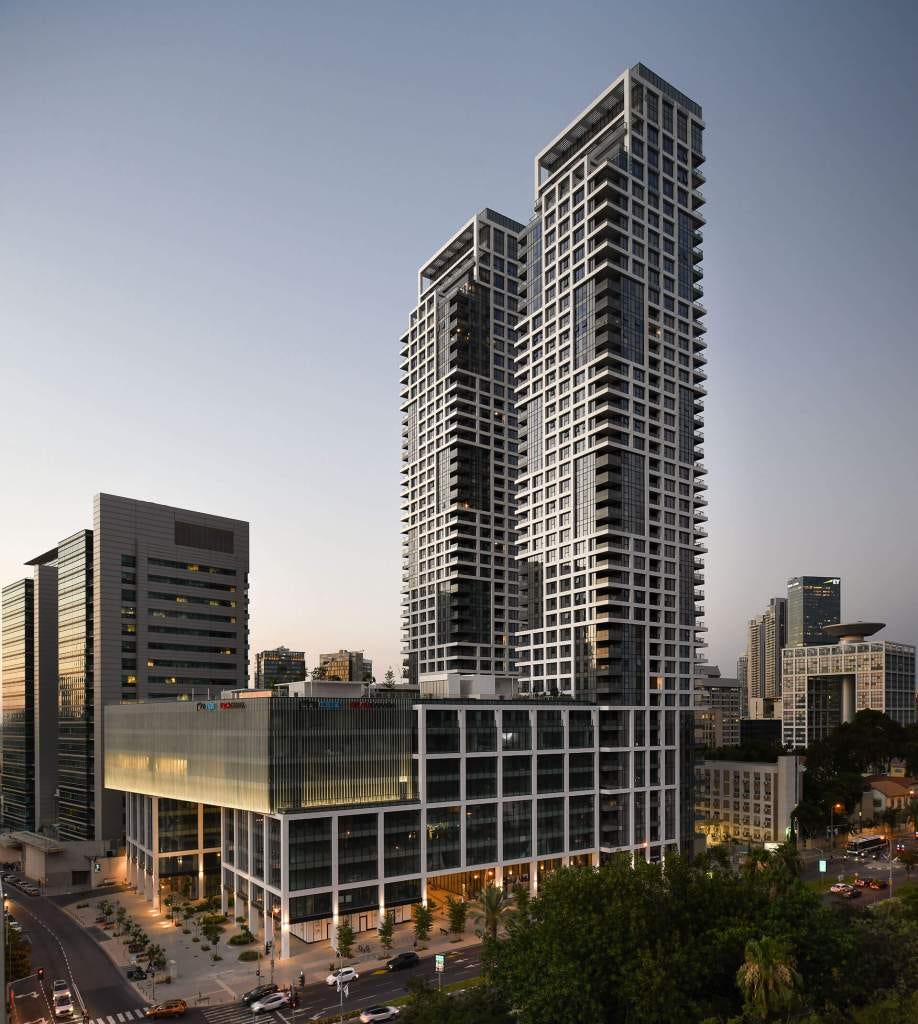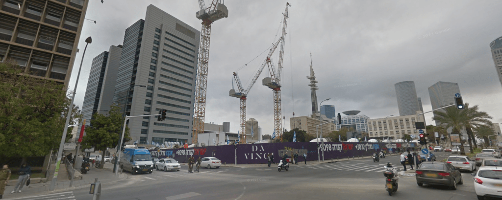 Una foto promozionale che mostra il complesso Da Vinci, pubblicata dall'Israel Canada Group. Sulla sinistra si vedono le torri Kannarit, dotate di scudo antideflagrante, dell'Aeronautica Militare israeliana, e sulla destra il caratteristico quartier generale militare israeliano. |
