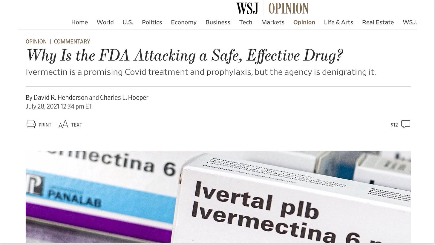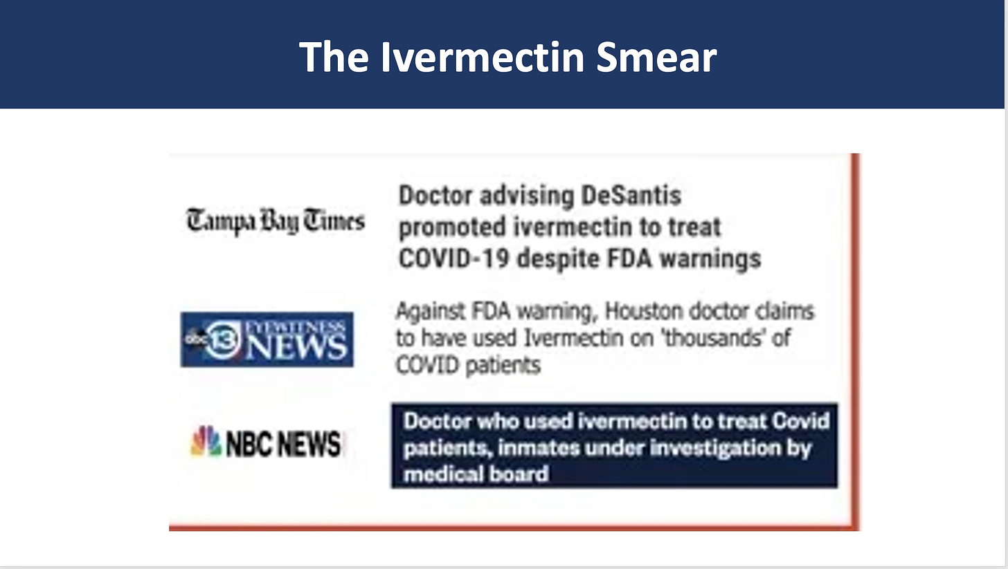La diapositiva qui sopra mostra 3 titoli di luglio-agosto 2021, che diffamano i medici che hanno osato prescrivere l'ivermectina ai loro pazienti, senza spiegare perché ciò rappresenti un problema. Il Wall Street Journal è stato l'unico membro dei media mainstream a contestare questa falsa narrazione, in un editoriale: