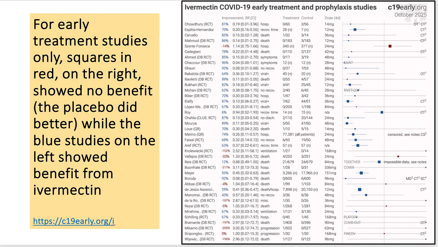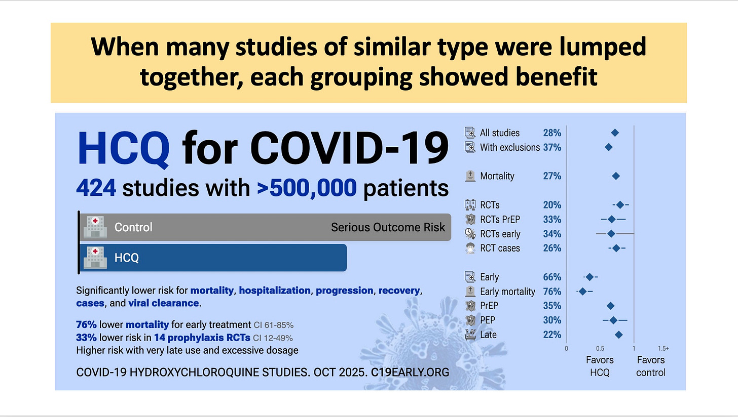 In caso i soliti censori di blogger insensati e fuorilegge dovessero censurare potete legger l'articolo di Meryl Nass su SaDefenza SubstackQuesta diapositiva è stata aggiornata per mostrare i 424 studi che hanno valutato l'HCQ per il COVID. Se somministrato precocemente, l'HCQ ha funzionato meravigliosamente. Se somministrato tardivamente, ha funzionato male, diluendo l'effetto complessivo. È per questo che i funzionari della sanità pubblica si sono espressi contro il trattamento precoce in generale? Il COVID è l'unica malattia che i medici consigliano di trattare tardivamente ma non precocemente, il che è controintuitivo e assolutamente sbagliato.