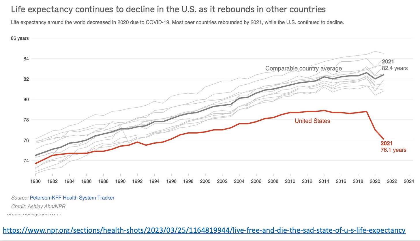 La diapositiva seguente utilizza i dati di mortalità del CDC (linea rossa) insieme ai dati di nazioni comparabili in grigio. Con il peggioramento della qualità del cibo e l'aumento dei costi dell'assistenza medica, la nostra aspettativa di vita è peggiorata rispetto alle nazioni comparabili.