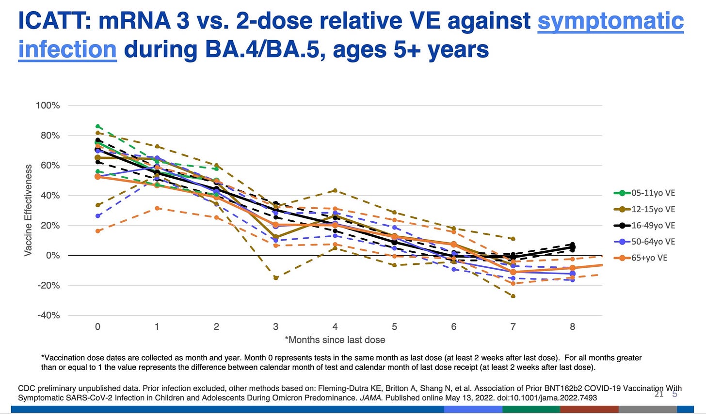 Di seguito è riportata una vecchia diapositiva del CDC che presenta alcune lacune, ma ci mostra che l'efficacia dei vaccini anti-COVID per tutte le fasce d'età è scesa a zero dopo circa 6-7 mesi. Dopodiché, il CDC non ci mostra cosa succede all'efficacia, ma sappiamo dai dati del Regno Unito che la situazione peggiora ulteriormente, in altre parole, si diventa sempre più suscettibili al COVID.