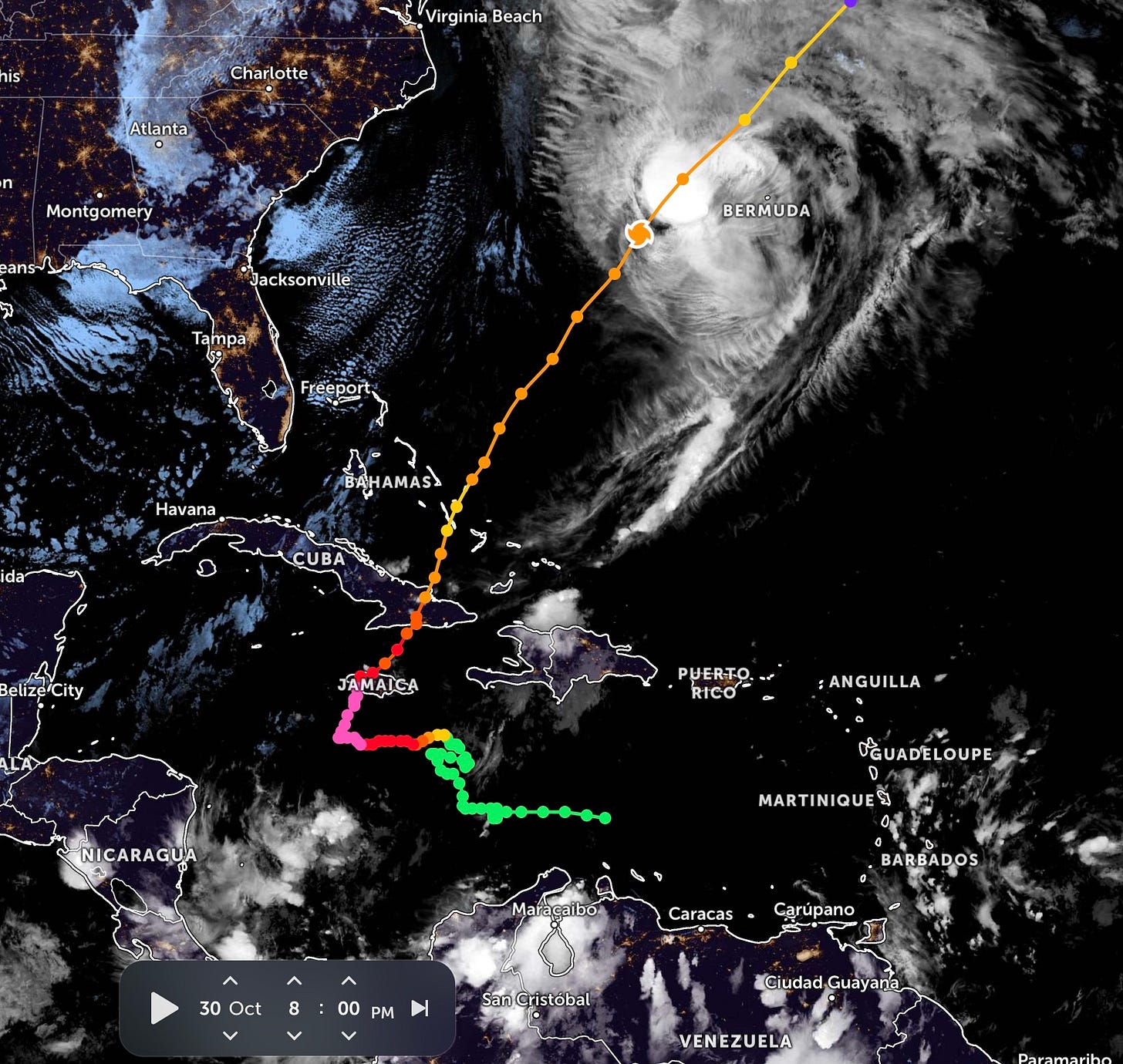Grazie ai miei meravigliosi lettori , sono stato indirizzato a una buona fonte per la mappa. Vedi sotto. La traiettoria tortuosa mentre si formava e si preparava per la Giamaica è (credo) tipica. Da allora in poi è stato un percorso rettilineo. Nessuna deviazione o rallentamento evidente. Spero che i meteorologi si spaventino all'idea di ripetere l'esperienza in tempi brevi.
