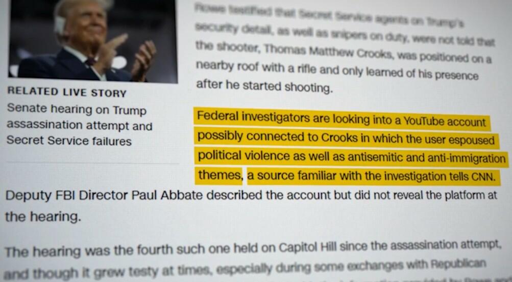 Due settimane e mezzo dopo l'attacco, una "fonte vicina alle indagini" ha dichiarato alla CNN che "gli investigatori federali stanno esaminando un account YouTube probabilmente collegato a Crooks, in cui l'utente ha sostenuto la violenza politica e temi antisemiti e anti-immigrazione " .