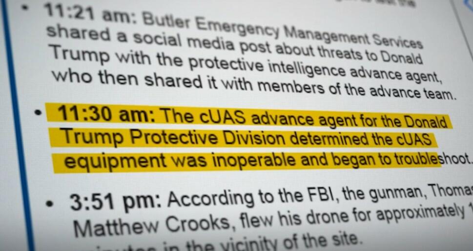 - Il giorno dell'attacco, Crooks effettuò operazioni di sorveglianza a Butler, facendo volare un drone sopra il luogo del raduno per 11 minuti, proprio mentre il sistema anti-drone dei servizi segreti era misteriosamente fuori uso .