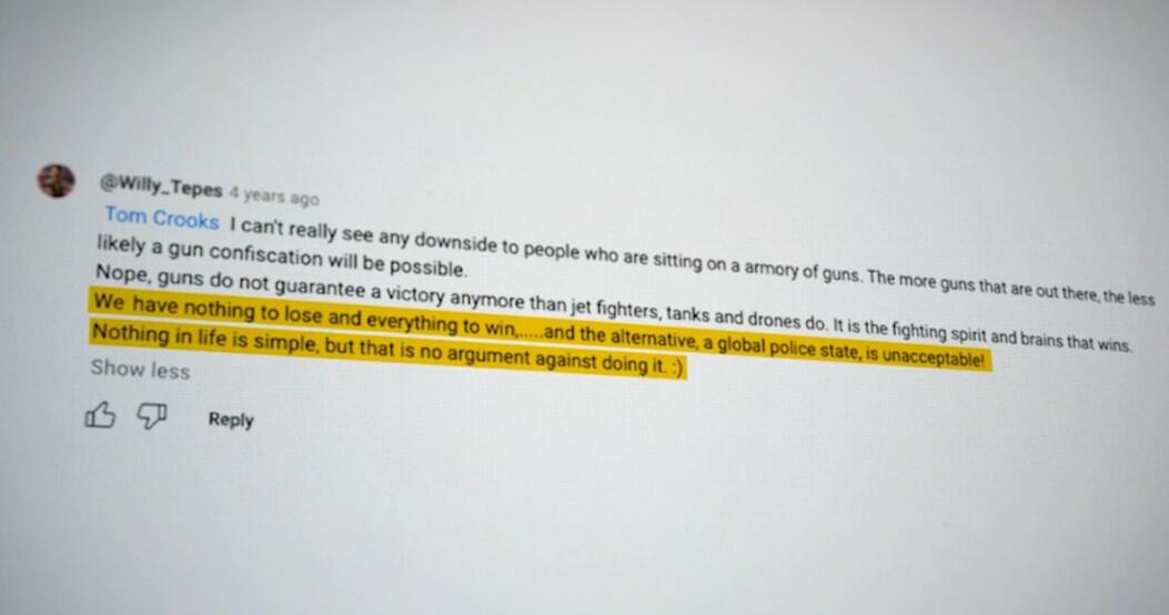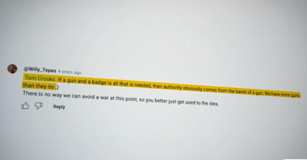Poi, un utente di YouTube @Willy_Tepes ha iniziato apparentemente a incoraggiare Crooks... scrivendo "Se tutto ciò che serve è una pistola e un distintivo, allora l'autorità deriva ovviamente dalla canna di una pistola. Noi abbiamo più pistole di loro ;)"