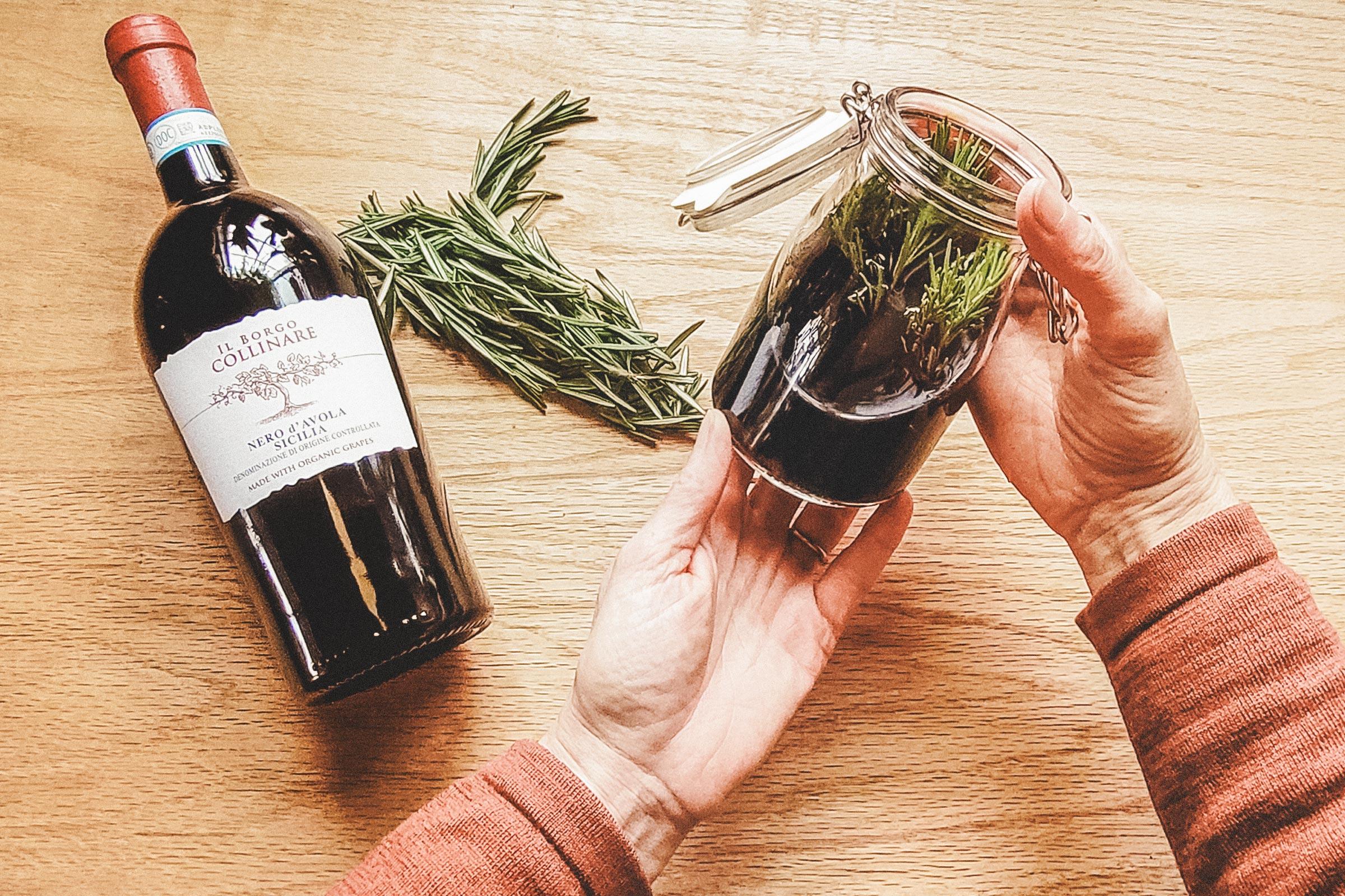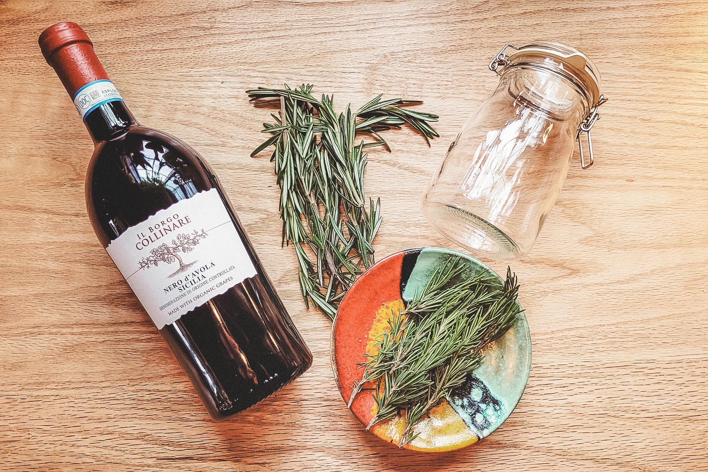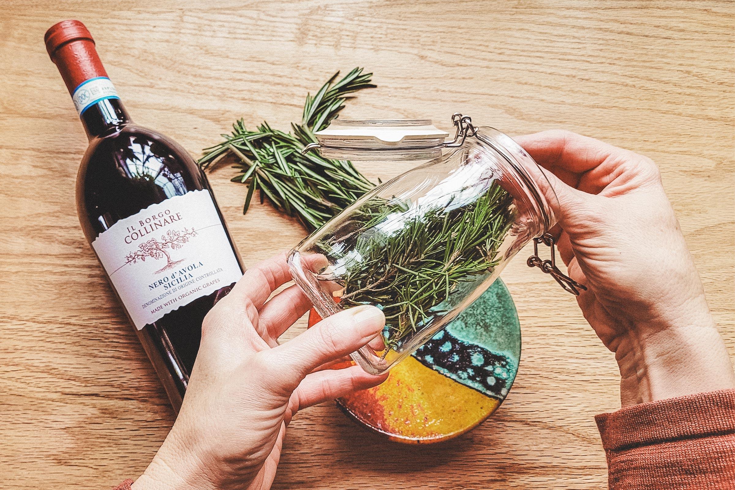 Fase 3: Versare il vino rosso fino a coprire completamente il rosmarino, quindi chiudere bene il barattolo.