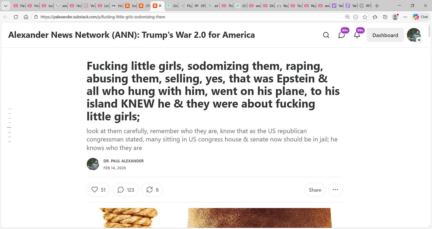 EPSTEIN: Scopare ragazzine, sodomizzarle, violentarle, abusare di loro, venderle, sì, questo era Epstein e tutti quelli che stavano con lui, sapevano che quello era il loro lavoro, non erano con Epstein per parlare di affari, gli stavano intorno per scopare anche loro delle ragazzine... organizzando tutto... che alcune alla fine lo facessero o no... salirono sul suo aereo, sulla sua isola, SAPEVANO che lui e loro volevano scopare ragazzine; non è una scienza missilistica.